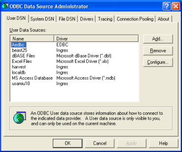 Note:To switch ODBC DSNs divers previously for the ODBC 2.8 driver to the new ODBC 3.v driver, remove the DSN by selecting it in the ODBC Data Source Administrator Information Sources list, and clicking Remove. Add the DSN again using the new ODBC commuter.